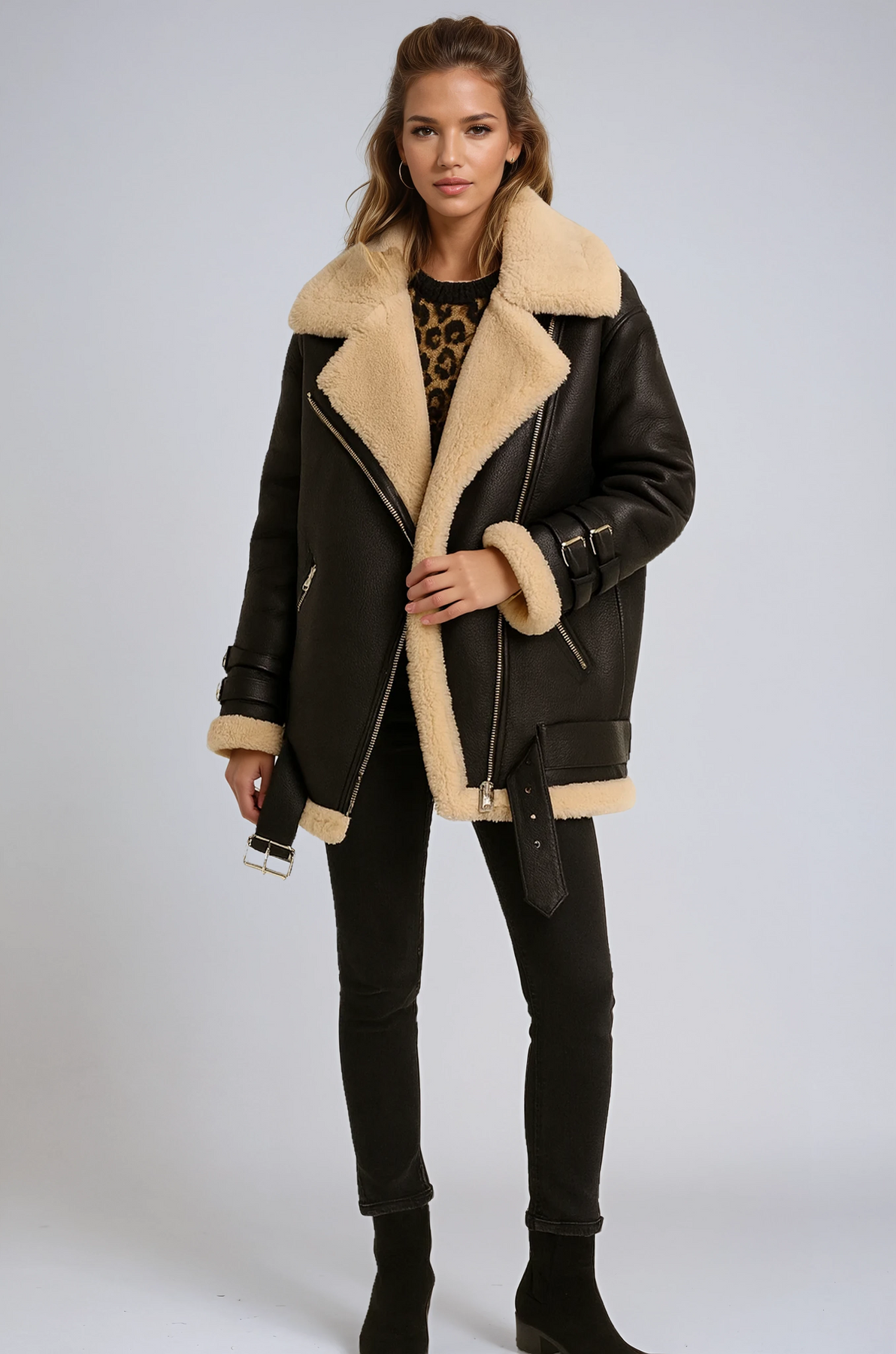 This women's bomber jacket with sheepskin lining is the perfect combination of classic style and contemporary design. Made of high-quality suede-finish fabric, it features soft, pleasant-to-the-touch sheepskin inside and on the wide collar. Distinctive straps with buckles at the cuffs and bottom hem add a modern touch. This model combines style, functionality and comfort in one.